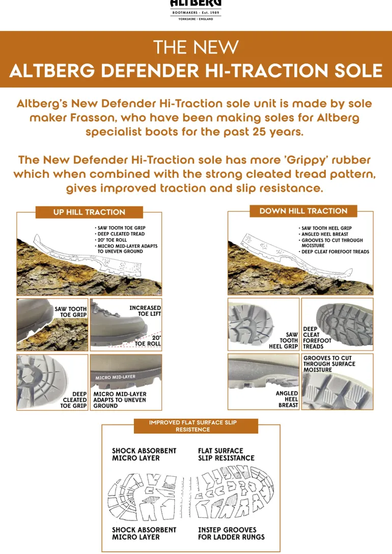 There is a rolling changeover of sole units from the original Vibram Masai version to the Defender Hi-Traction Sole – which offers improved up-hill traction, downhill braking and Slip Resistance: (Shown in product pictures)