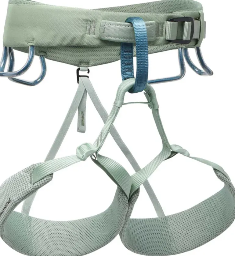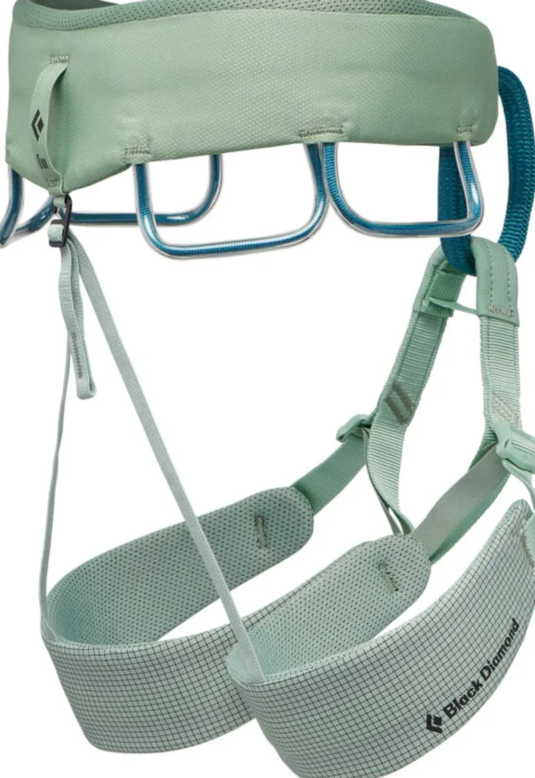 For all-around female climbers who know that time spent fiddling with leg loops and adjusting a pinching waistbelt is time wasted, the Women’s Black Diamond Momentum Harness delivers a time-saving design for all styles of climbing.