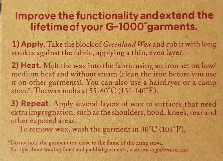 In addition to the wax making garments wind and water-resistant, it also increases durability and extends the life of theG-1000 fabric.