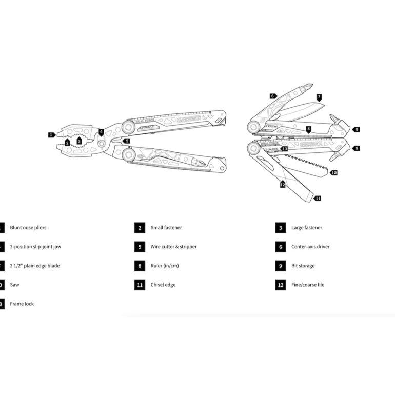 Blunt nose layered construction jaws, small fastener pliers, regular pliers, adjustable 2-size slip-joint jaw, wire cutter, wire stripper, 8.26CM fine edge blade, 8.5CM Centre-Drive Axis Tech, saw, fine/coarse file, chisel edge, #2 and #3 cross drive, med flathead driver, 2ØCM ruler, lanyard hole, fabric sheath.