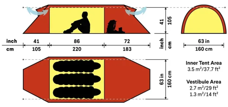 The tunnel construction offers maximum, and plenty of space for 3 occupants, the design requires only four pegs for quick pitching and the continuous pole sleeve and tensioner system makes this tent quick to pitch, take down and remarkably stable. The outer tent walls extend to the ground and the mesh areas are backed with adjustable fabric panels. The extended, GT version is an especially good choice for dog mushers and cycle tourers because the extra large vestibule allows plenty of storage space for sled or bike equipment.