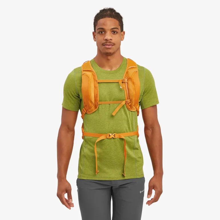 Easy-to-access and adaptable storage includes wrap-around pockets, the modular Montane T-Hook system, and a stretch mesh front pocket, for fuel, drinks and spare layers. Vertical and horizontal compression straps secure the load, while the T-Hook system can be configured to carry walking poles in the mode that best suits your activity, whether you’re running your favourite trail, or fast packing off the beaten track.