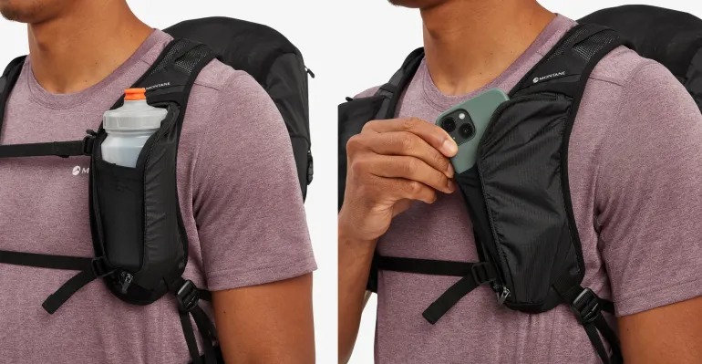 - Shoulder strap pockets with a mesh gusset to fit both soft flasks and hard bottles.