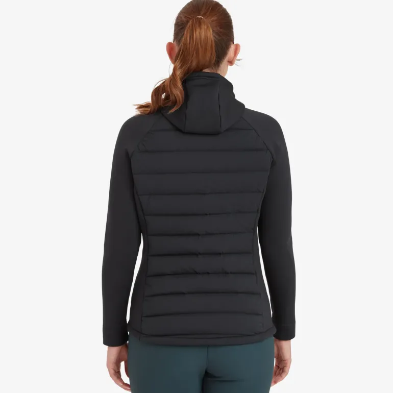 The Montane Women’s Composite Hooded Down Jacket is a protective, durable thermal layer designed for unrestricted movement in cold conditions. A durable design is delivered through use of Pertex Quantum 3D weave fabric with 2-way stretch, this offers extreme, durable protection that can withstand the harshest of elements. Combining this fabric with THERMO Stretch Fleece provides a precision fit that allows for ultimate freedom of movement. HyperDRY 750+ fill power Duck down with PFC-Free DWR greatly improves thermal performance in wetter conditions and keeps your core body warm when you need it! Built with movement in mind, the Composite down jacket will keep you warm and protected when taking on a range of fast-paced activities in the mountains, including climbing or hiking.Features