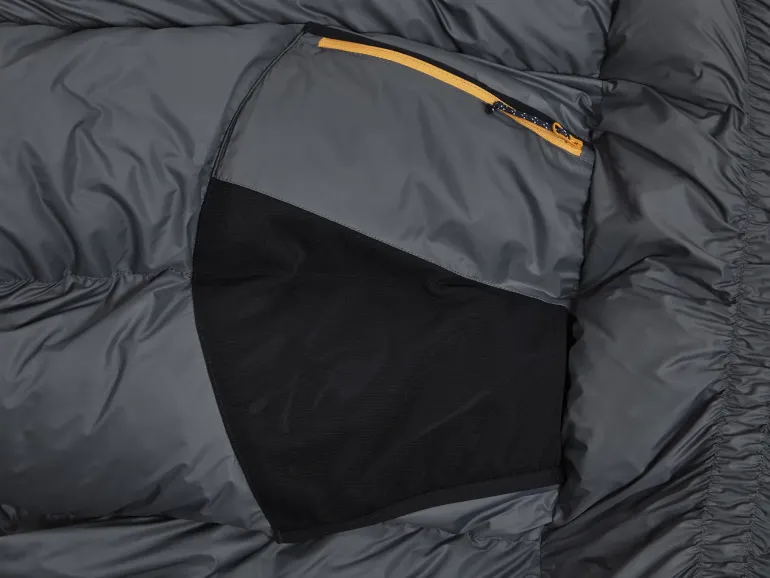 Vertically aligned chest and foot V-baffles prevent the down from migrating to the sides, ensuring optimum warmth along with the 7 baffle low volume anatomically shaped hood. Full length Gemini zip baffle and integrated neck collar with Lode Lock closure prevents snagging and allows for efficient opening and closing. Internal zipped pockets keep essentials warm and dry, and a waterproof roll-top stuff-sack and storage cube are also provided.
