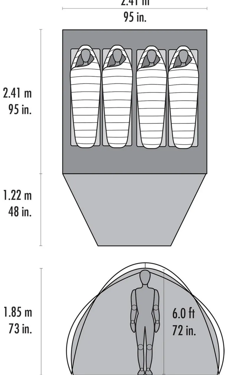 High ceiling and vertical sidewalls let everyone move about comfortably, lounge and stand up to change. Door pocket allows for wide, easy entry. Storage pockets for each occupant; extra hang loops; strategically placed mesh for airflow and privacy; enormous vestibule for outside gear storage. Polyurethane waterproof coating.
