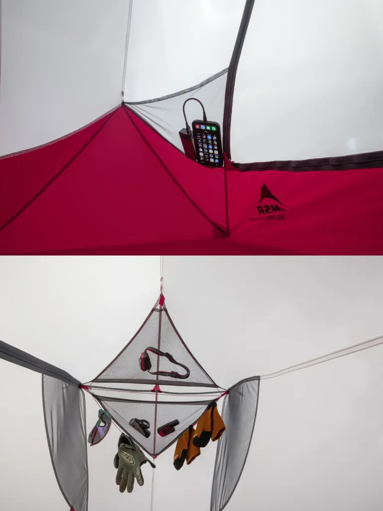 The true rectangular floor (no foot taper) is large enough for all your gear, and 38 inches (0.97 m) of headroom lets you sit up comfortably. The tent body is a blend of mesh and solid fabric that provides airflow, privacy and weather protection. The no-curve tent door feature zippers that are easy to use with one hand. It also zips closed to a single point, so you always know where to open the door, even in the dark. Tech-friendly pockets feature cable ports at the corners for charging cords, and large overhead gear loft pockets are perfect for gloves, sunglasses, and other quick-access items. An interior clothesline and optional exterior clothesline provide ample space to hang damp gear.