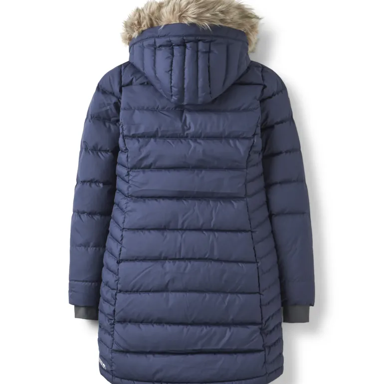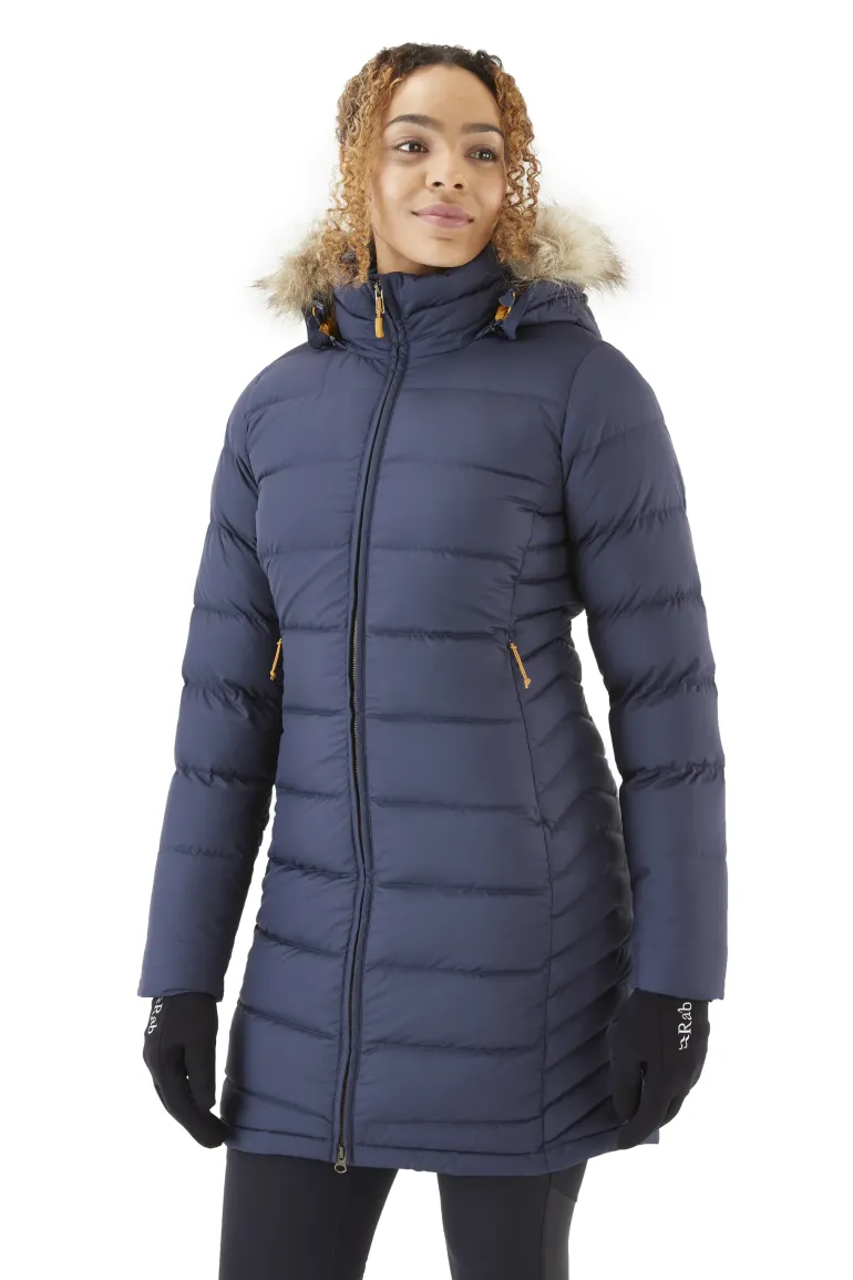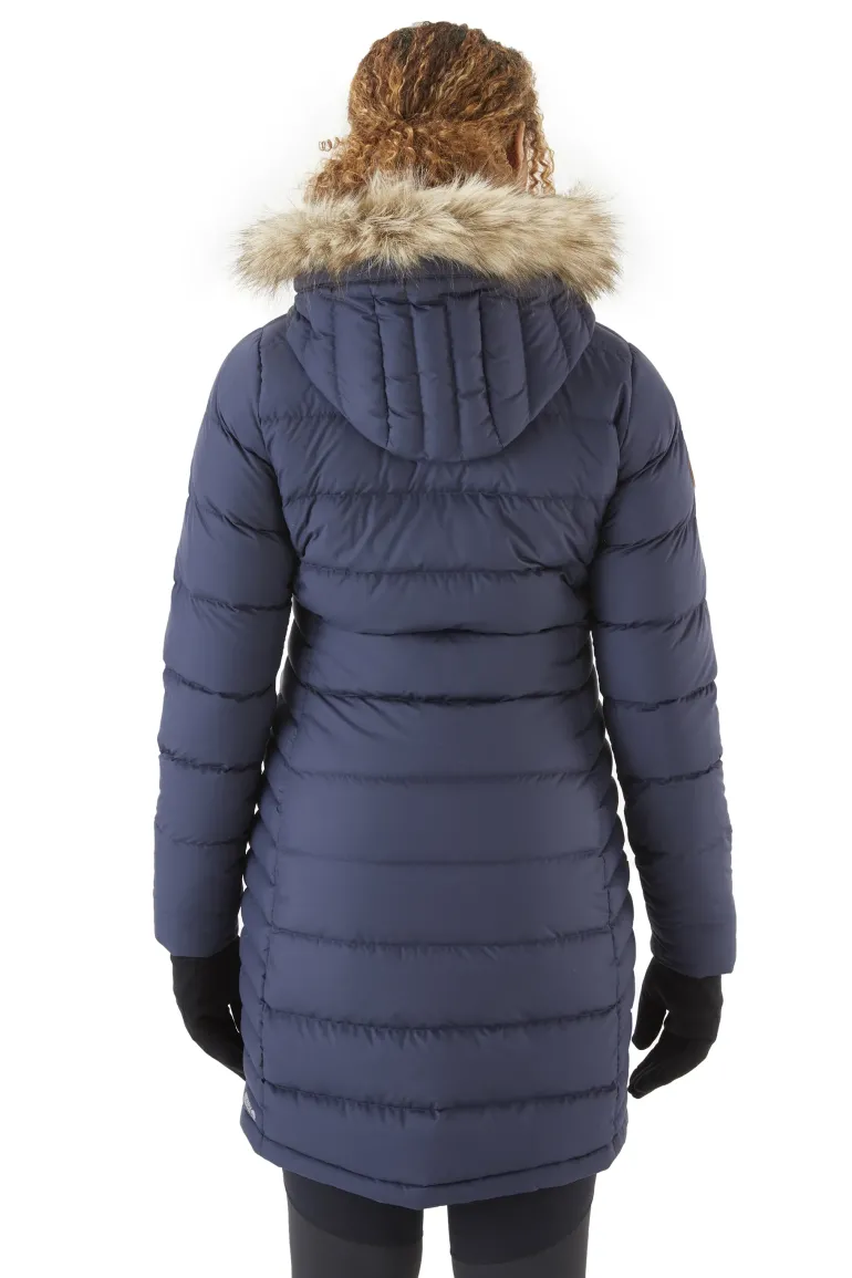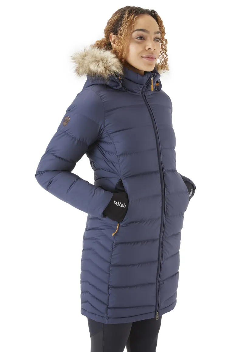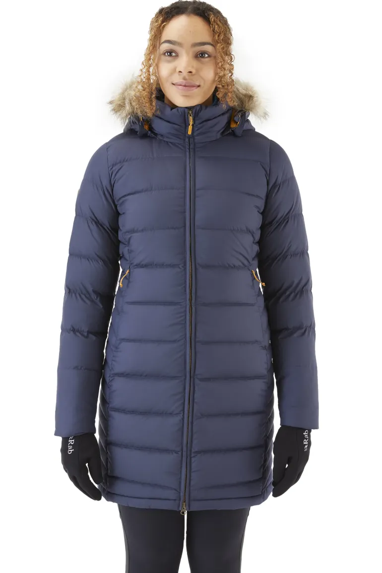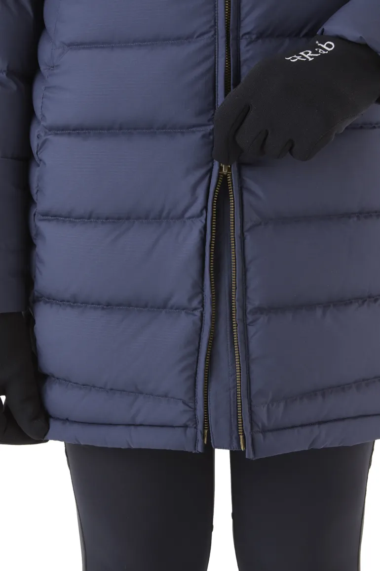 Cosy down with the Rab Women’s Deep Cover Parka. With a slim, flattering fit designed to provide top to bottom protection from the elements.