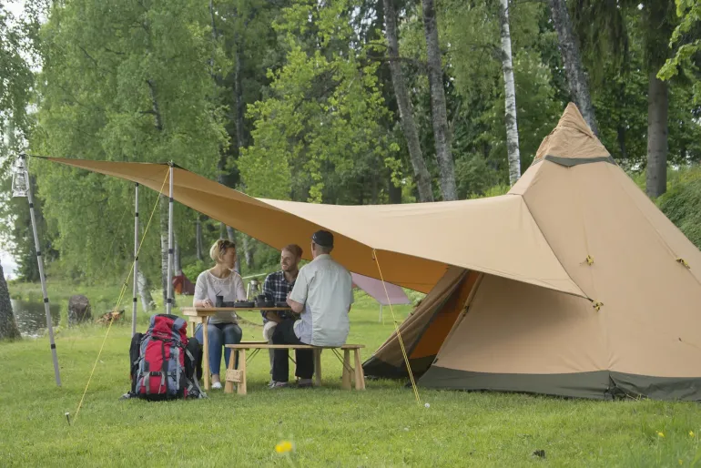 Not just for use with a tipi, this tarp can be pitched alone to create a shaded living area.