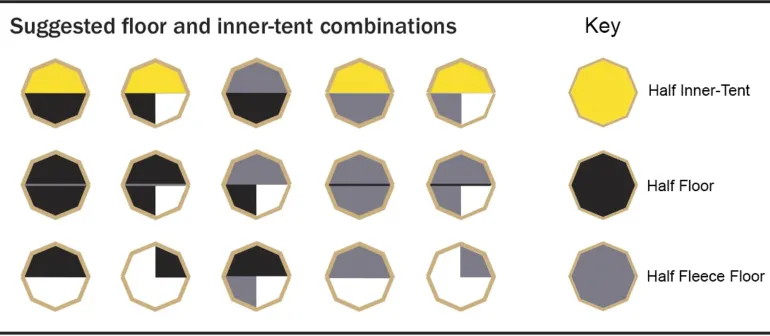The half floor offer versatile living as they can be used in conjunction with the Half-Inner Tent, the Half Floor, or on its own. This allows you to create separate sections inside your tipi, and they can easily be attached and detached by Velcro. Please see images for suggest combinations.