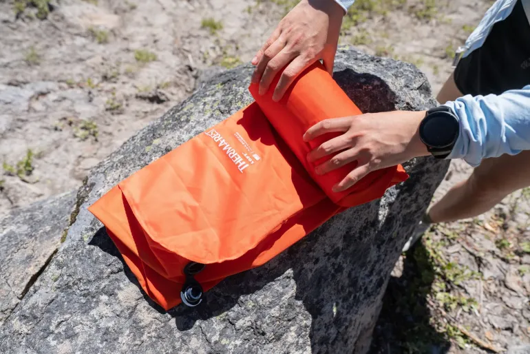 On the outside, the NeoLoft’s surface is made of a plush stretch knit fabric (the NeoLoft is the first ever air pad to be made with stretch knit). Stretch knit is a base layer-like fabric with multi-directional elasticity and is FAR softer to the touch than the nylons typically used to make backpacking pads. Its stretch properties improve the NeoLoft’s contouring support and help to minimize pressure points by locally conforming to the shape of your body. On the inside is the ContourCore Matrix—the epicentre of the NeoLoft’s backcountry-ready specs. It efficiently insulates by minimizing convective heat loss with two stacked rows of triangular chambers, while ThermaCapture™ reflects body heat back at you, delivering an all-season R-value rating of 4.7. Along the sides, we built in large chambers that rise to form side rails when the pad is inflated. These give your body a tactile sense of the pad’s edge and cradle you towards its centre to prevent roll-off.