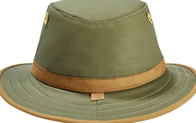 The TWC7 Tilley Outback Hat, designed with a medium brim, employs a modern waxed cotton technology that can be washed, worn, packed, used and abused. The hatband and binding in traditional British Tan contrasts the rugged olive colour, resulting in a Hat with true ‘bush-whacking’ appeal. Over time, the waxed cotton fabric develops a leather-like appearance that weathers to the nuances and character of each Hat owner.