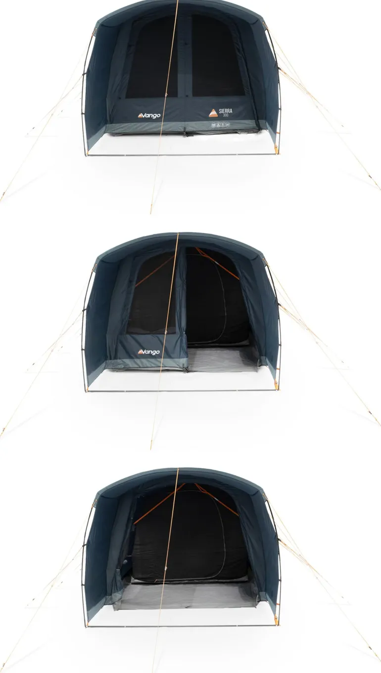 The front door with two large mesh panels can be rolled to the side to fully open up the living area, and a built-in front extension offers generous extra living space, and gives a sheltered entrance to your tent, preventing rain from dripping into the living area.