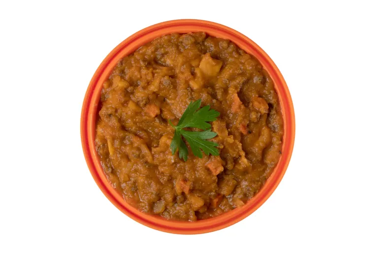 A blend of minced beef, diced potato and carrots in a tomato and garlic sauce.