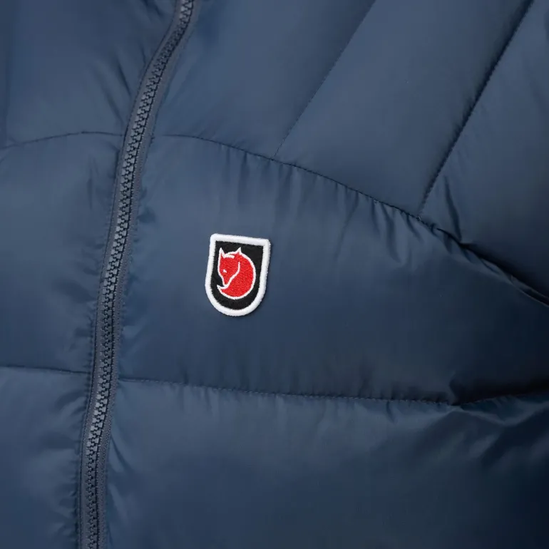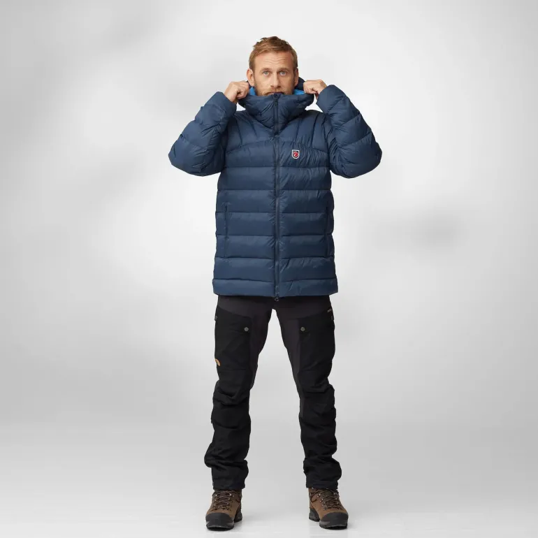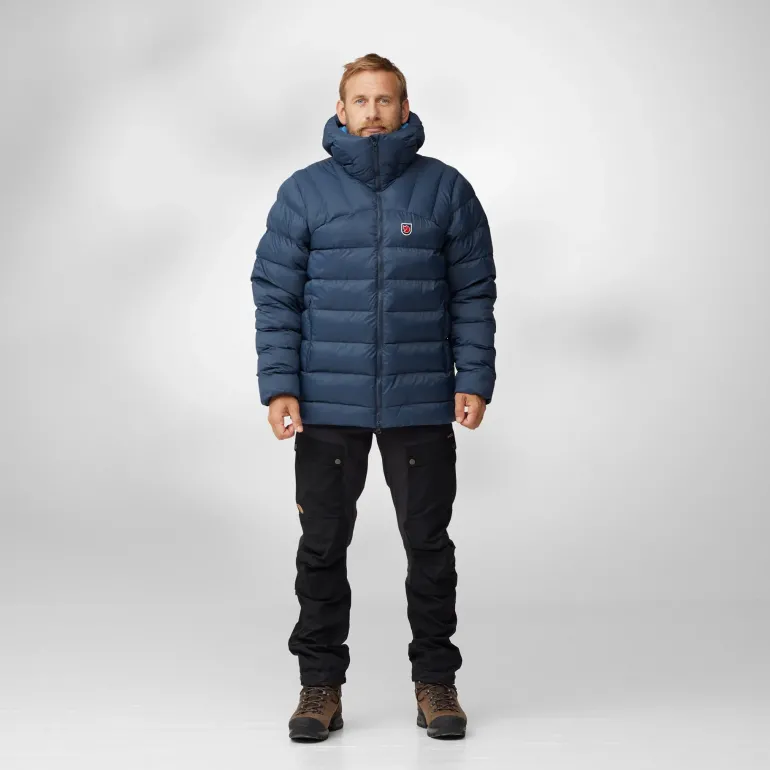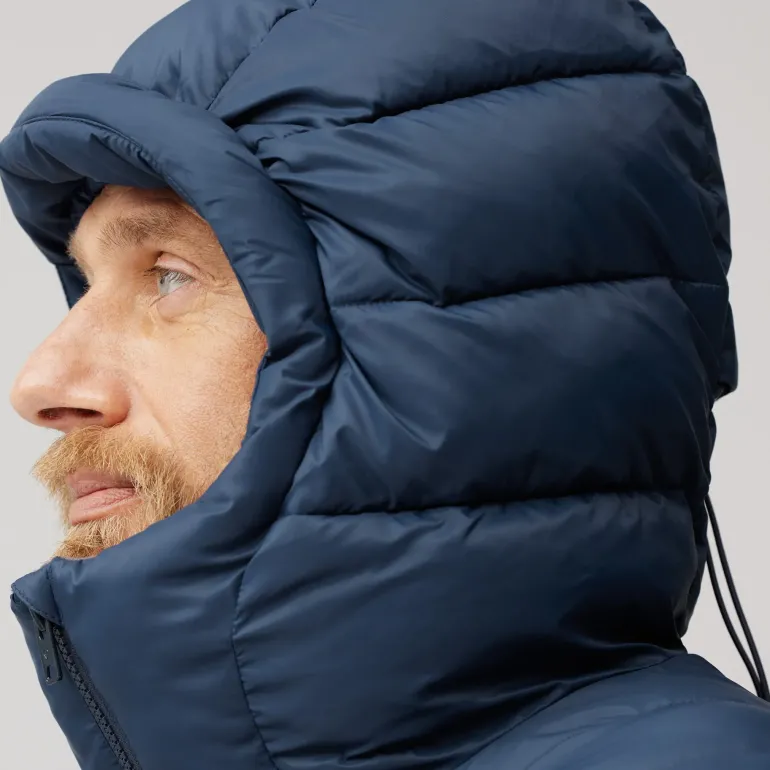 Expedition Mid-Winter Jacket for men has room for thicker mid-layers underneath and a dropped hem at the back to keep the rear warm. Shell and lining in pliant recycled polyamide and padding in recycled polyester that retains its loft, even when damp. Multiple pockets and pack bag in main fabric that can be used for repairs.