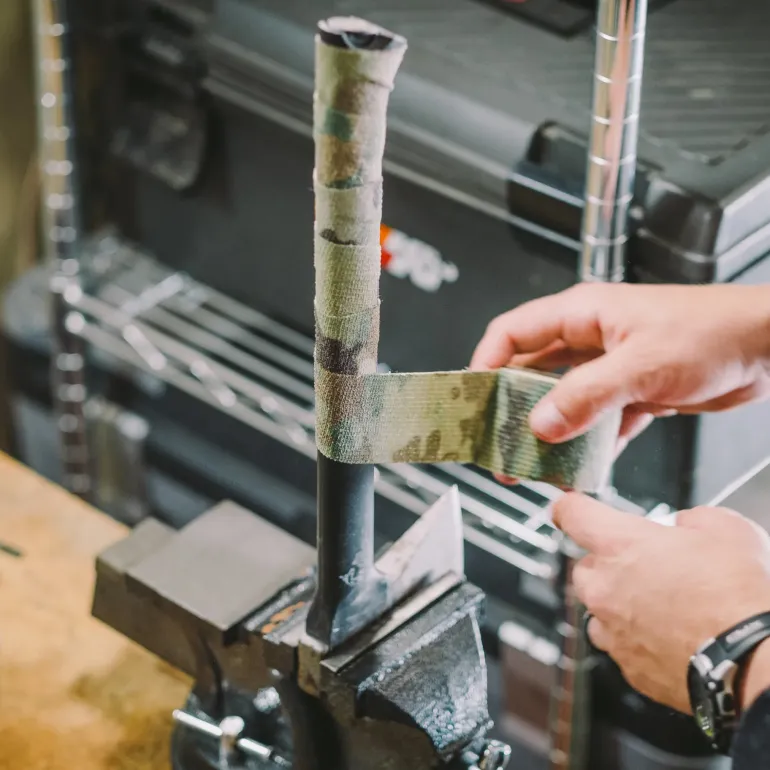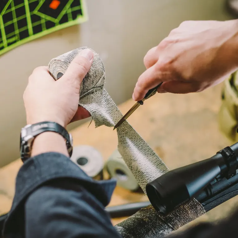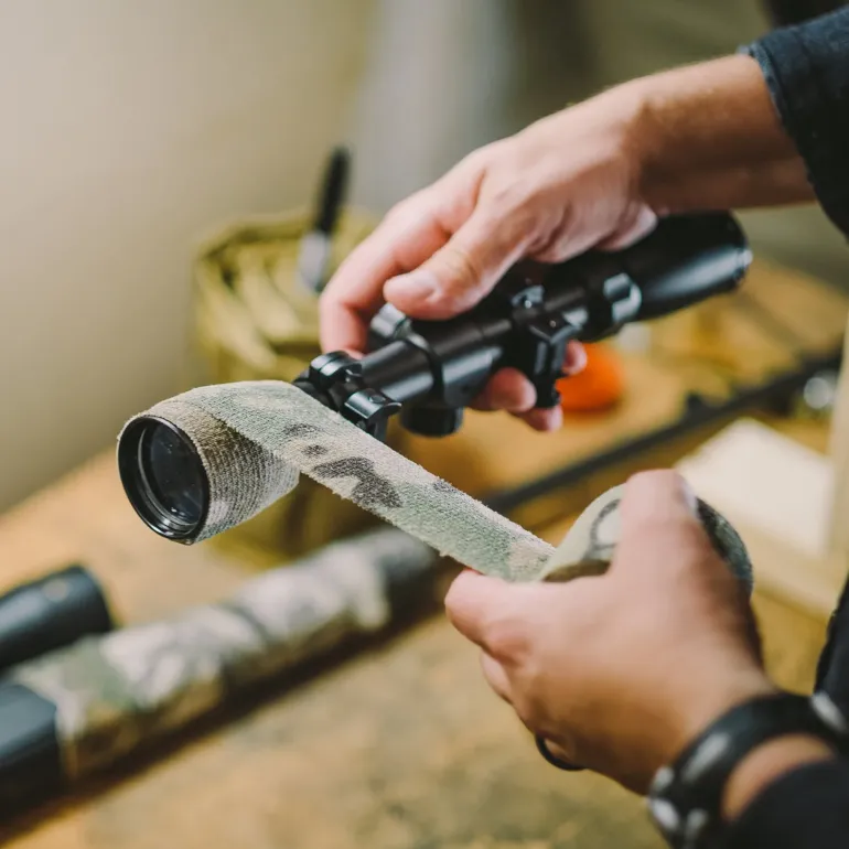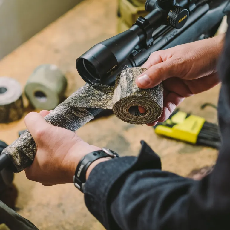Properly camouflage firearms and equipment without leaving behind a sticky residue with Camo Form Reusable Fabric Wrap.