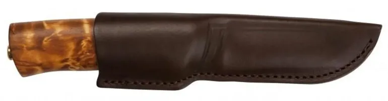 The substantial curly birch handle is shaped to form a finger guard, it gives a solid feel in the hand and is comfortable for both medium and large hands. Supplied with a genuine leather sheath.