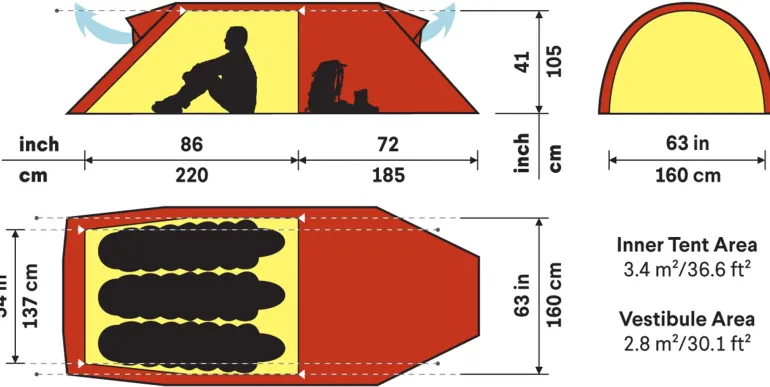 The vestibule door opens from the bottom, sides, or top and is backed with a removable mesh door for insect free ventilation. Two integrated stowage pockets help to keep you organised, the high bathtub floor keeps out groundwater. Adjustable vents on the ends are backed with adjustable no-see-um mesh and air-permeable snow-proof panels, both of which are accessible from inside or outside the tent.