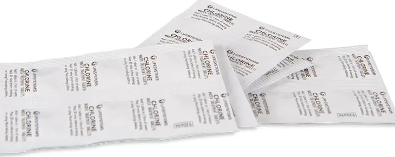 Chlorine is a widely used water disinfectant which kills most viruses and bacteria in water and treats up to 60 litres of water.