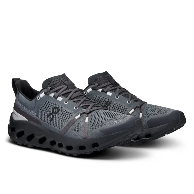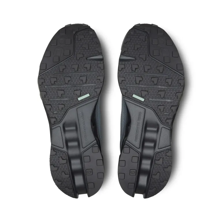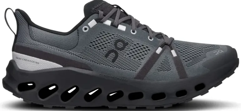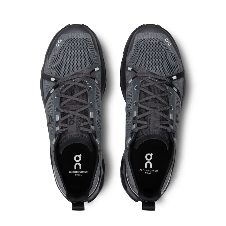 The Cloudsurfer Trail is ON’s first-ever trail running shoe powered by CloudTec Phase®. This computer-optimized technology delivers a smooth ride and energy return you’ll feel from heel to toe. To make light work of everyday trails and moderate inclines, rain or shine. Leave no stone unturned with tread you can trust. The Cloudsurfer Trail features a Missiongrip™ rubber outsole for support and stability on wet and dry surfaces, with a versatile lug pattern for added traction. When developing the Cloudsurfer Trail, ON figured out a way to use less TPU plastic. Instead, they replaced it with functional embroidery applied on a base mesh of recycled polyester. It’s the same On performance elements. Just made with less.