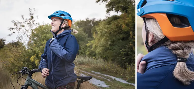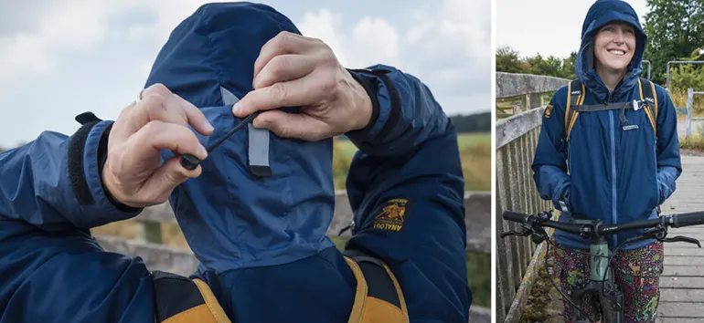 - The hood can be rolled away securely using a hook and loop tab on the rear of the hood and passing it through the hanging loop of the jacket.