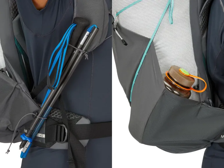 Grab kit quickly and easily with the simple roll top opening, which allows the pack to expand with larger loads and compress as you work through supplies. The large front stash swallows up extra layers, while side stash pockets and harness pockets provide on-the-go access to water and snacks. There’s also space for a 3L hydration bladder inside, and poles can be fixed to the outside of the pack when you need to keep your hands free.