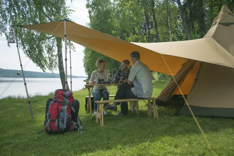 Not just for use with a tipi, this tarp can be pitched alone to create a shaded living area.