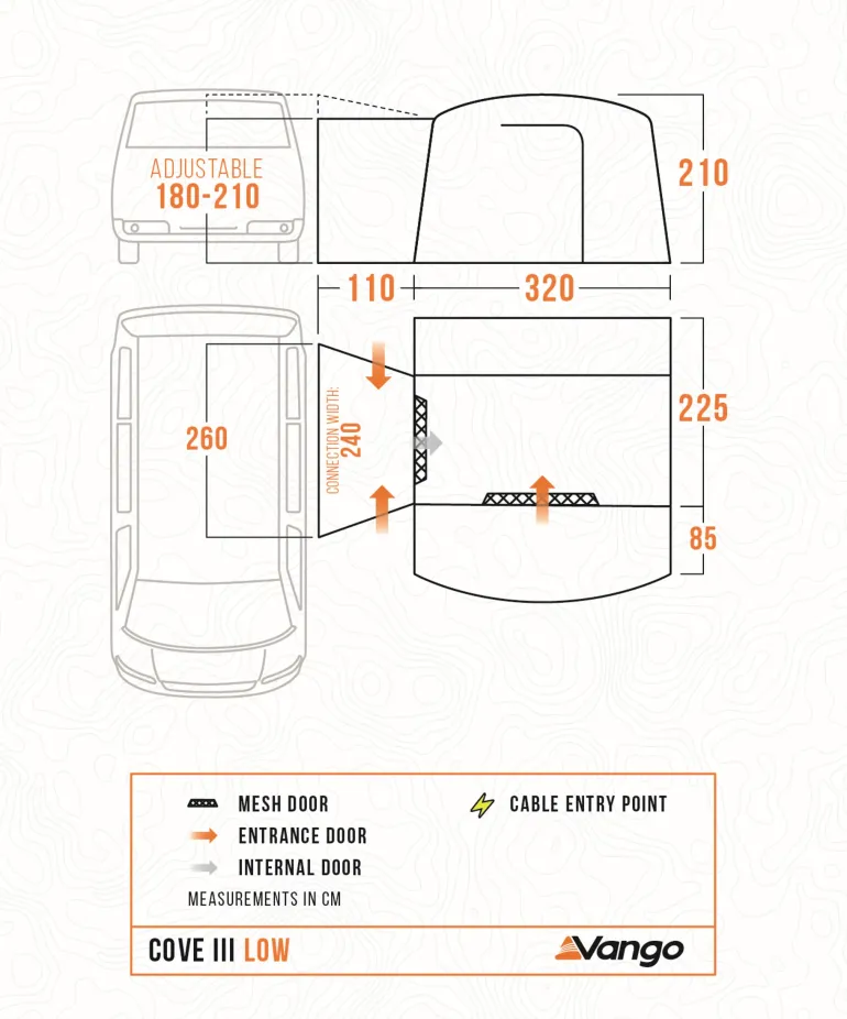 Designed to fit campers and van conversions with an attachment height of 180cm-210cm, this awning can be attached to your vehicle via various attachment options. This awning comes complete with a 260cm long, 6mm Kador connector strip, a pole sleeve, Velcro tabs and webbing straps, allowing this awning to be attached to all vehicles.